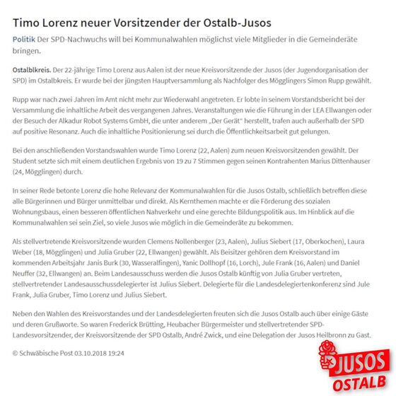 Unser stellvertretender Kreisvorsitzender und Vorsitzender des SPD-Ortsvereins Aalen Timo Lorenz wurde am vergangenen Wochenende mit einem überzeugenden Ergebnis zum Chefredakteur des Kontra - Das Landesmagazin der Jusos Baden-Württemberg gewählt! Wir freuen uns sehr für ihn und sind davon überzeugt, dass das KONTRA unter seiner Leitung weiterhin florieren wird!
